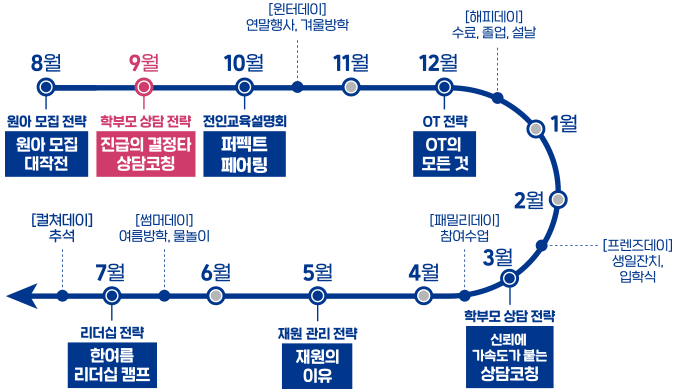 재원생이 한 명이라도 더 늘어나면 우리 원의 내년이 든든해집니다. 원장님 혼자 고민하는 것이 아닌 우리 원 교직원 전체와 진급상담의 목표 설정부터 설득을 위한 상담 스킬의 조건까지 함께 알아보는 시간을 가집니다.