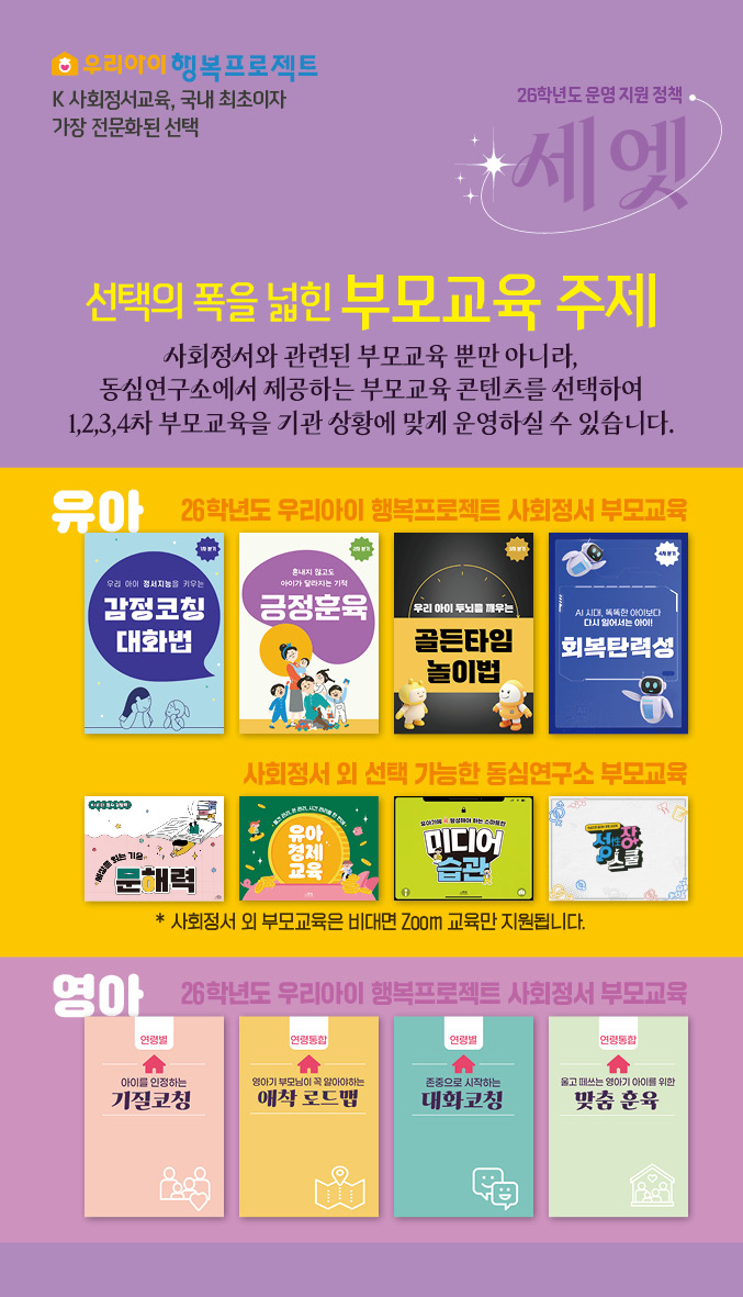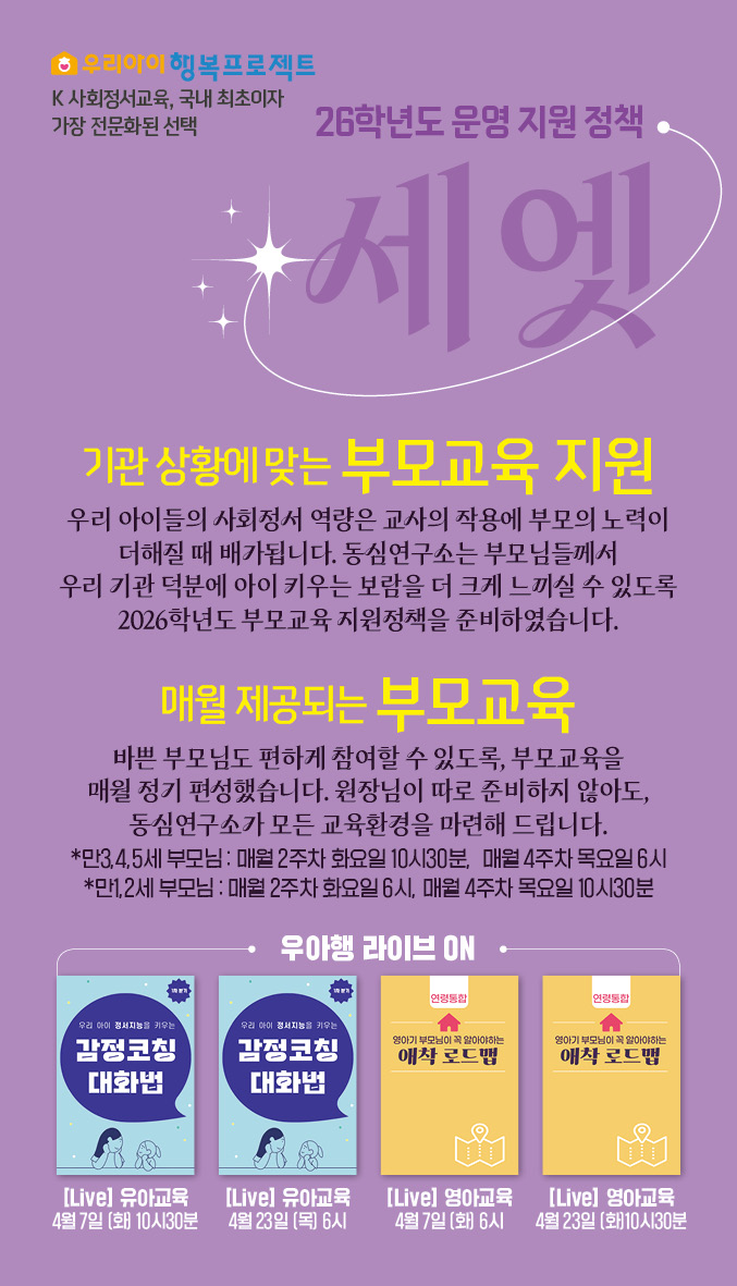 2026학년도에도 대한민국 유아교육 기업 동심이 제공하는 사회정서학습 프로그램과 함께 아이들을 위한 꼭 필요한 교육에 앞장서 주시기를 부탁드립니다.