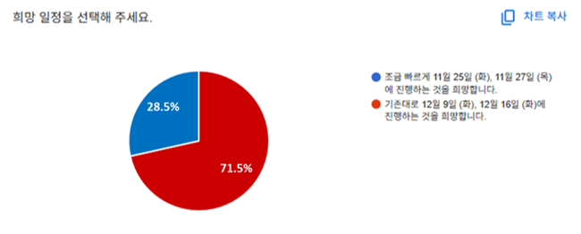 기존 일정 유지에 동의하였기에 오리엔테이션은 12월 9일과 12월 16일에 예정대로 진행됨을 알려드립니다.