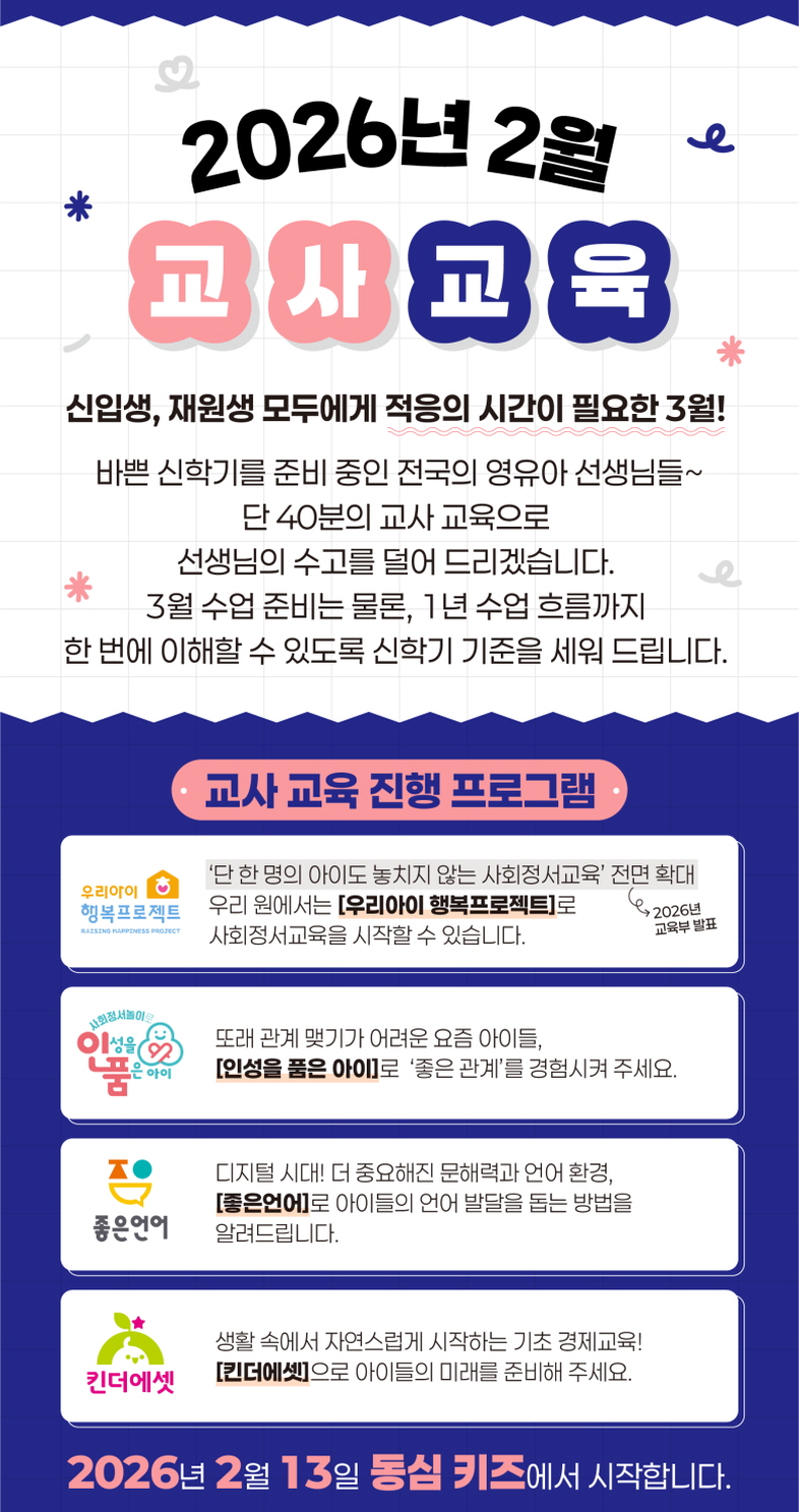 바쁜 신학기 준비 기간, 선생님의 소중한 시간을 아껴드리기 위해 동심키즈가 핵심만 콕 집은 '40분 교사 교육'을 준비했습니다.