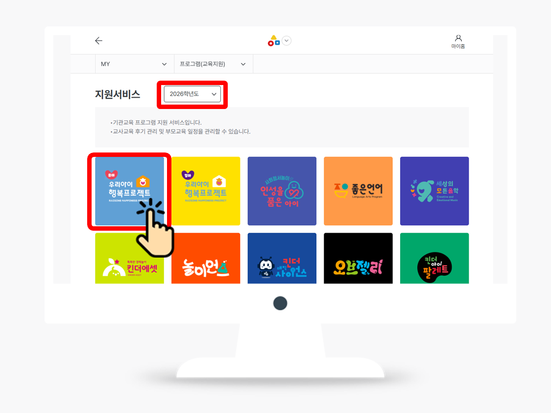 3. 동심키즈> 마이홈 > 지원서비스 - 2026학년도 우리아이 행복프로젝트(유아) 클릭