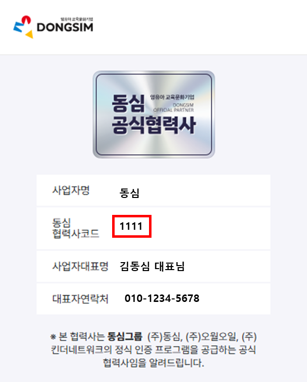 또는 명함 뒷면에 인쇄된 동심 협력사코드를 확인해 주세요.