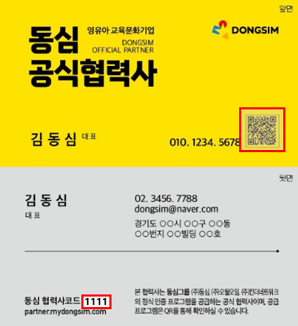 동심 공식협력사의 명함에 인쇄된 QR코드를 스캔 또는 명함 뒷면을 확인해주세요.