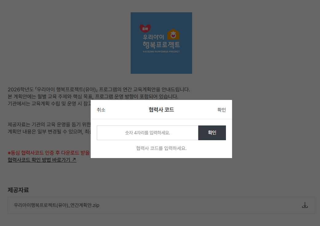 확인한 협력사코드는 동심키즈 [지원자료] 메뉴에서 제공자료 파일 다운로드 시 인증용으로 사용됩니다.