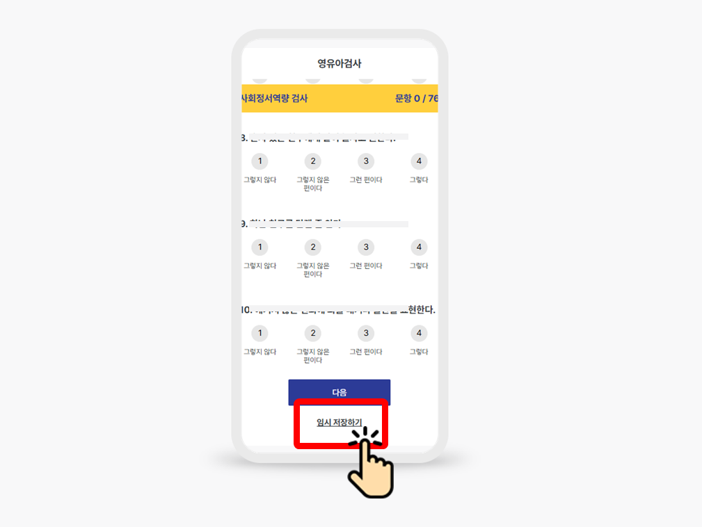 검사 중 임시 저장이 가능하며 24시간 이내 재진행 할 수 있습니다.